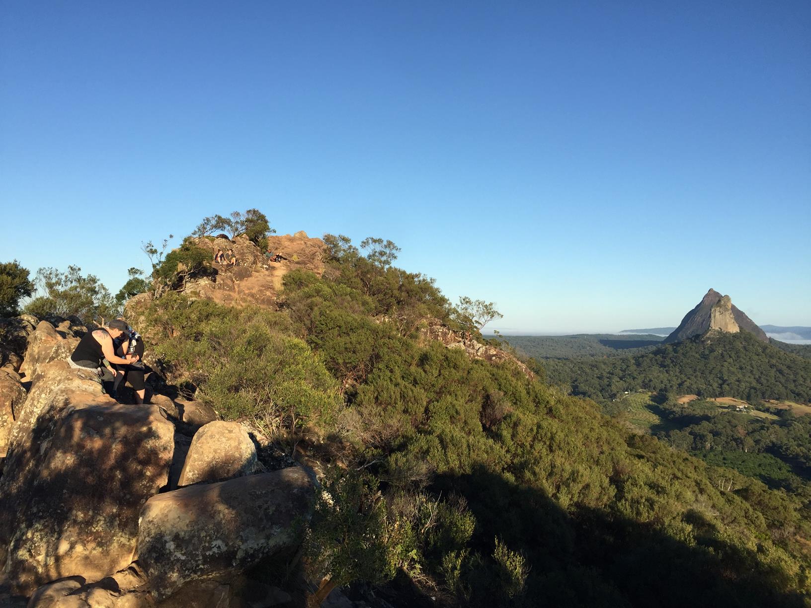 At the peak there are 360 degree panoramic views of the entire region. And best of all there are no manmade incursions up there unlike some of the other Sunshine Coast peaks. Supervise kids carefully, take your camera.