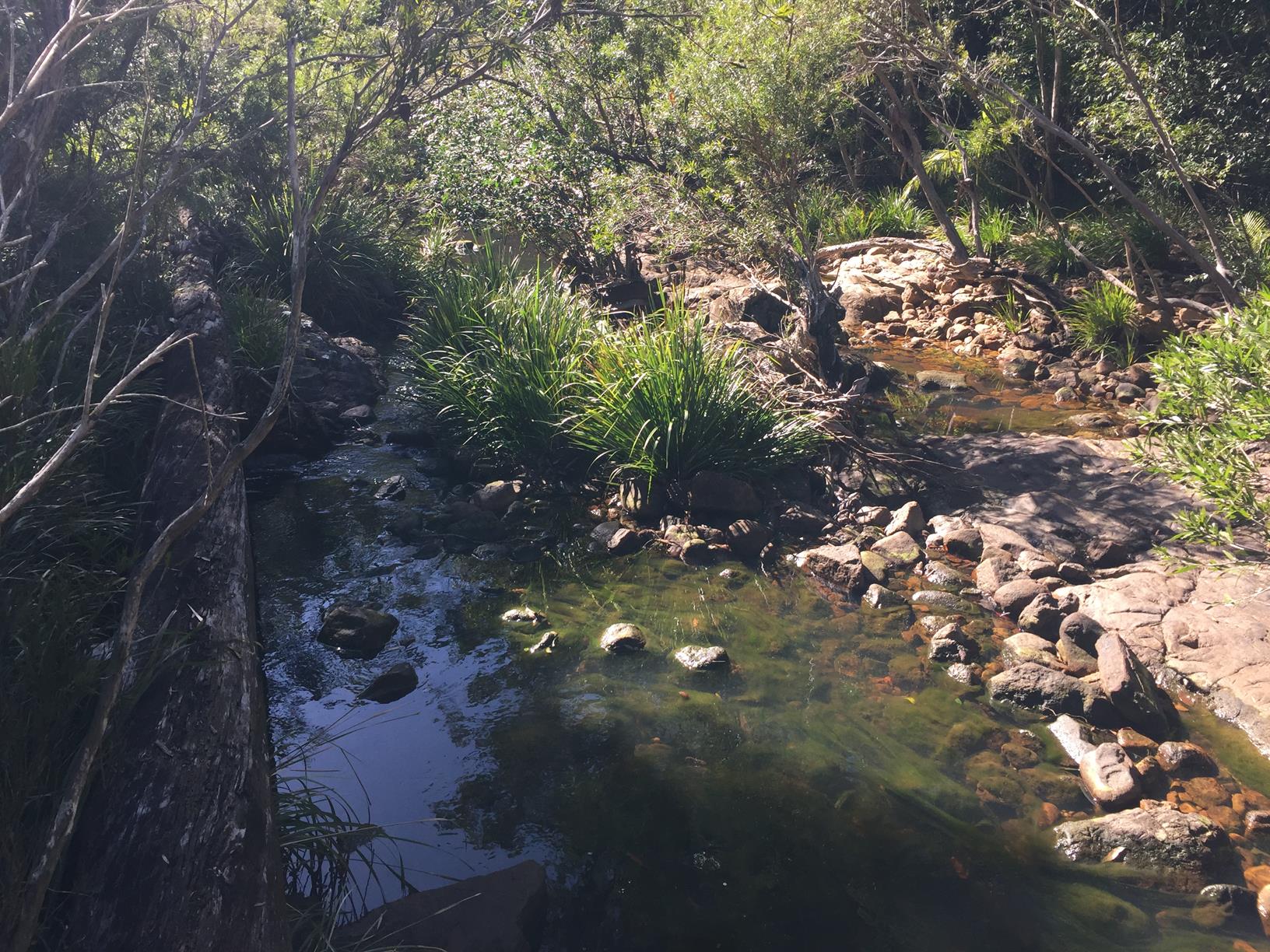 Follow this dirt road for approximately 1.5 km when you will cross a cattle grid. Park right by the National Park sign. The marked trail starts here off to your right. (The drive to the campground is beyond here but 4WD is recommended). Note: the lower creek crossing is at the entry sign; the other at the campsite is just boulder hopping.