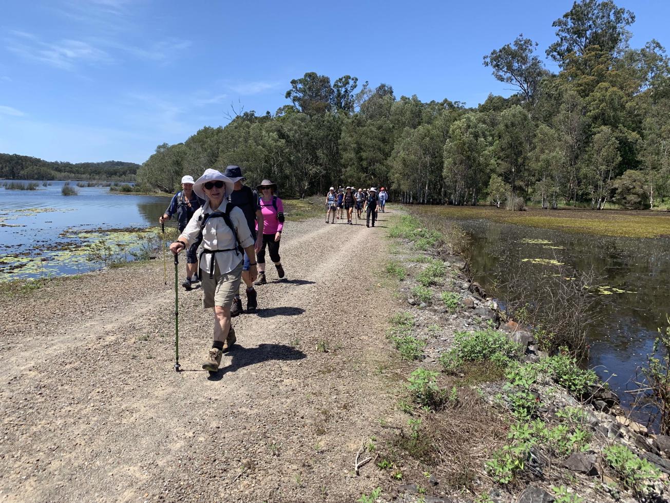 The trail is enhanced by a variety of birdlife throughout: willy wagtails, finches, whip birds, parrots, kingfishers, grey herons, ducks and pukekos, even pelicans in the distance. Along the way, near the lakes edge, you'll pass a big burnt out stump, once a giant a tree.