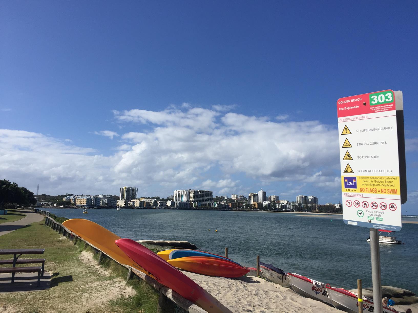 To the starting point: Drive to the Esplanade on Golden Beach and launch from any of the beach sand access points. You will need to park off the street. Alternatively drive to Lamerough Parade and launch from the boat ramp. Plenty of parking there or out front of Apex Park (there are public toilets in this park).